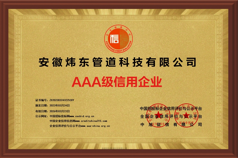 安徽炜东管道科技有限公司-企业信用等级证书-铜牌黄底40X60